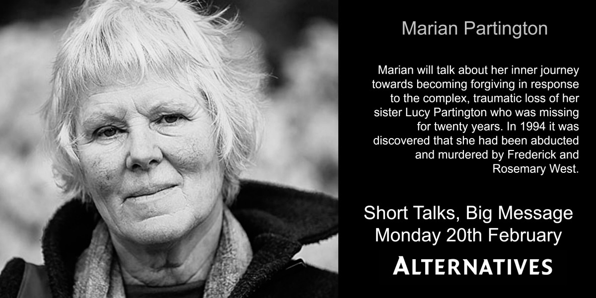 Marian Partington author of If You Sit Very Still, will talk about her inner journey towards becoming for-giving in response to the complex, traumatic loss of her sister Lucy Partington who was missing for twenty years. In 1994 it was discovered that she had been abducted and murdered by Frederick and Rosemary West. Marian works with the Forgiveness Project in prisons and schools.