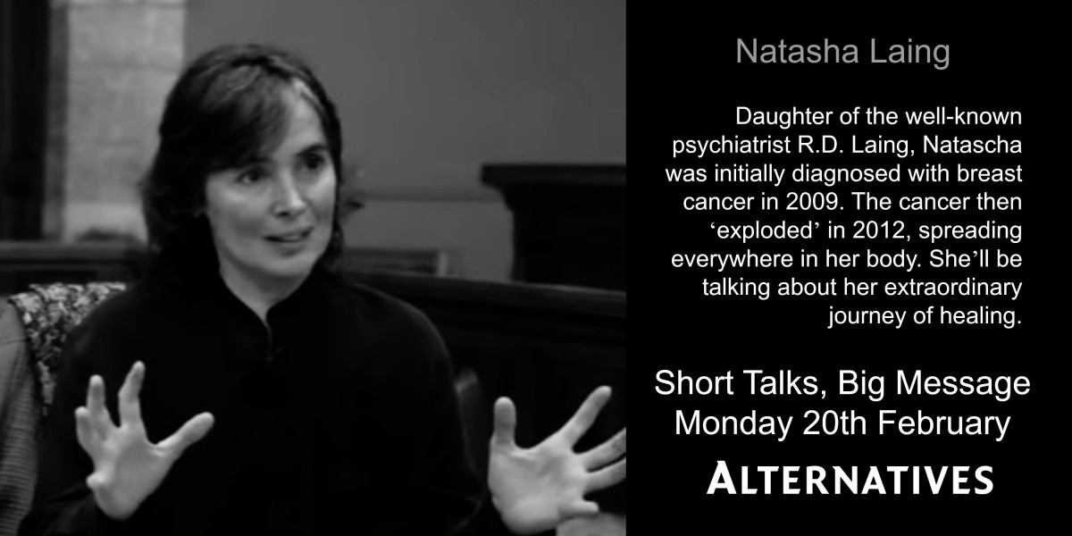 Natasha Laing whose father was the well-known psychiatrist R.D. Laing, was initially diagnosed with breast cancer in 2009. The cancer then ‘exploded’ in 2012, spreading everywhere in her body. She’ll be talking about her extraordinary journey of healing.