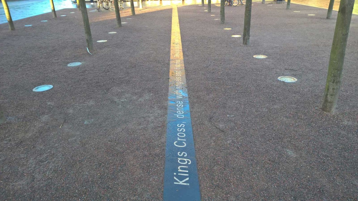 In 2012 a triad was installed at London’s newest open space: Granary Square, N1. The inscription – in granite – runs 70 feet along one side of the square and reads: “Kings Cross, dense with angels and histories, there are cities beneath your pavements, cities behind your skies. Let me see!” This triad, from an unpublished long poem titled The Brill, was originally spray-painted on the walls of Battle Bridge just before it was demolished. The developers somehow noticed it there and contacted AAD to ask if they could install the poem in Granary Square.